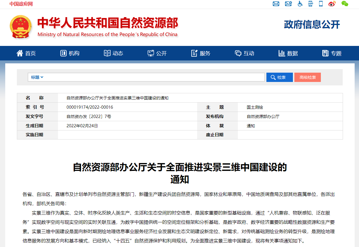 自然資源部辦公廳關于全面推進實景三維中國建設的通知